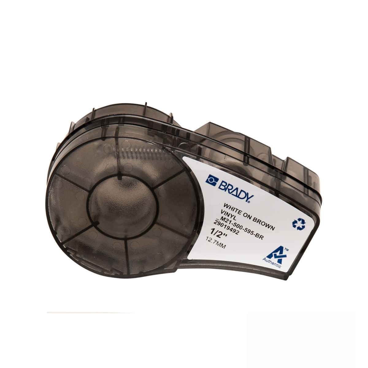 Etiqueta adesiva BMP21 de vinil na cor branco em marrom, com 12,70 mm de largura e 6,40 m de comprimento, compatível com impressoras BMP21. Ideal para identificação durável de cabos, fios e equipamentos, oferecendo resistência à abrasão, produtos químicos e desgaste ambiental, garantindo legibilidade confiável em ambientes industriais e comerciais.