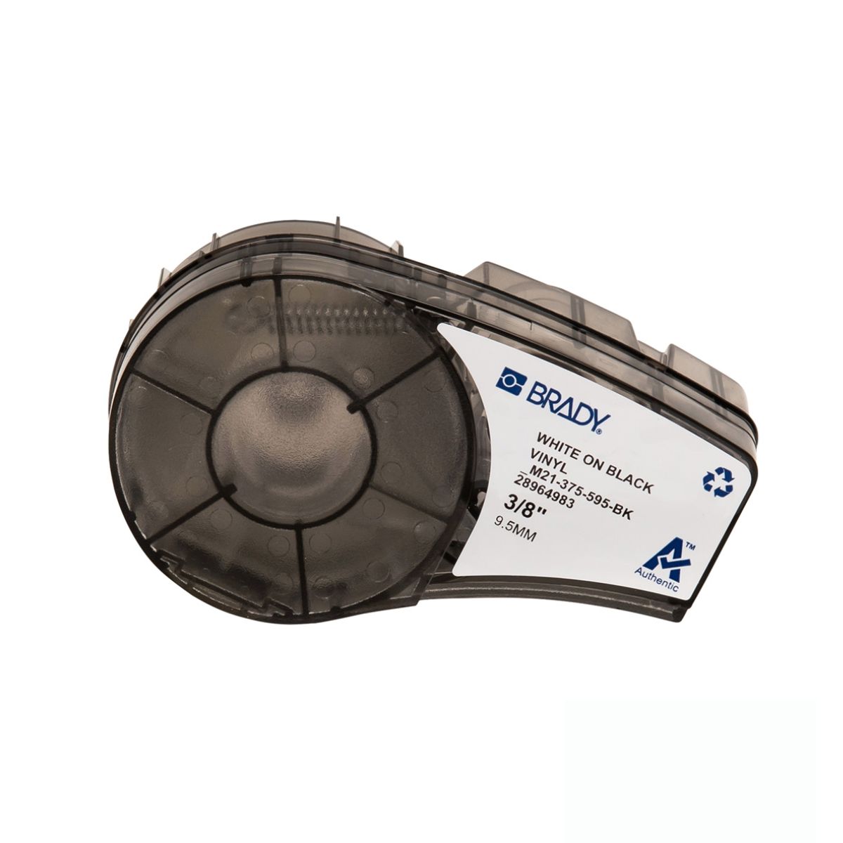 Etiqueta adesiva BMP21 de vinil na cor branco em preto, com 9,53 mm de largura e 6,40 m de comprimento, compatível com impressoras BMP21. Ideal para identificação durável de cabos, fios e equipamentos, oferecendo resistência à abrasão, produtos químicos e desgaste ambiental, garantindo legibilidade confiável em ambientes industriais e comerciais.