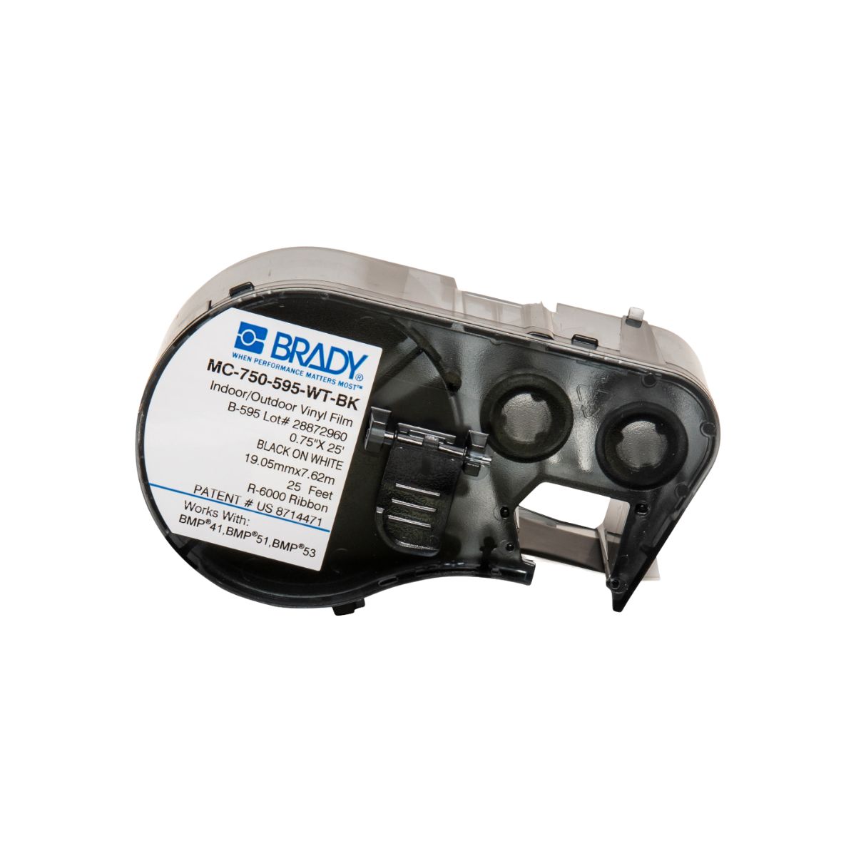 Etiqueta contínua em vinil B595 da Brady, na cor preto sobre branco, com largura de 3/4" (19,1 mm) e comprimento de 25' (7,6 m). Desenvolvida para uso com as impressoras BMP41, BMP51 e BMP53, proporciona marcações duráveis, resistentes e de alta legibilidade para aplicações industriais exigentes.
