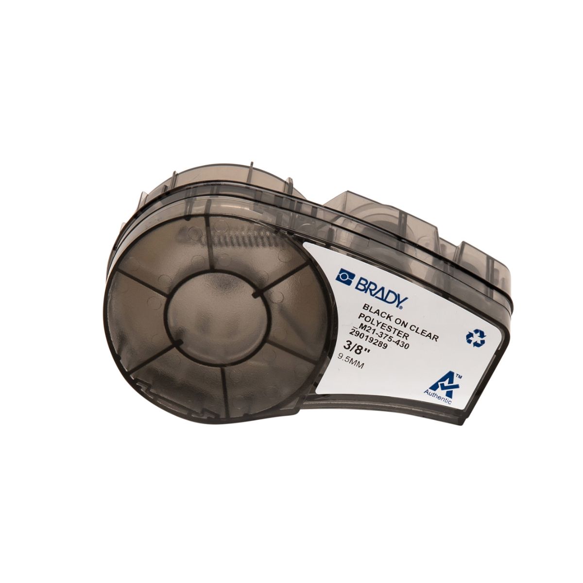 Etiqueta em poliéster B430 da Brady, compatível com impressoras BMP21 Plus e BMP Lab. Na cor preto sobre transparente, com largura de 0,375" (9,53 mm) e comprimento de 21' (6,4 m), ideal para identificação durável de fios e cabos, proporcionando excelente contraste e resistência a abrasão, produtos químicos e condições ambientais severas.