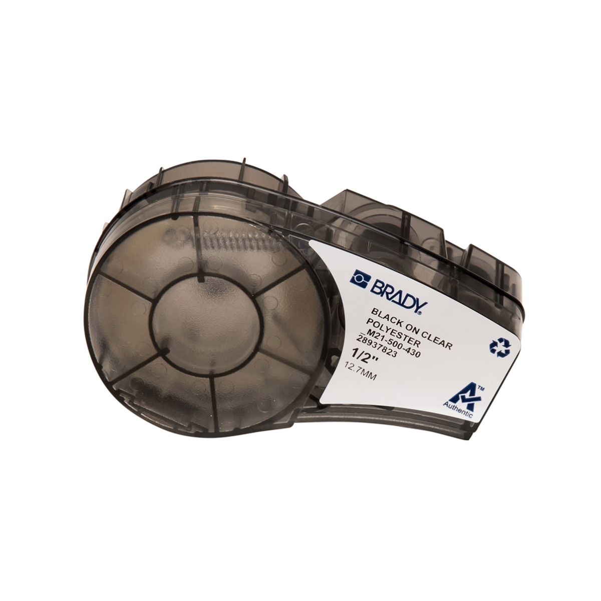 Etiqueta em poliéster B430 da Brady, compatível com impressoras BMP21 Plus e BMP Lab. Na cor branco sobre transparente, com largura de 0,500" (12,70 mm) e comprimento de 21' (6,4 m), oferece identificação durável e visível de cabos e fios médios, combinando legibilidade com resistência a abrasão, produtos químicos e condições ambientais variadas.