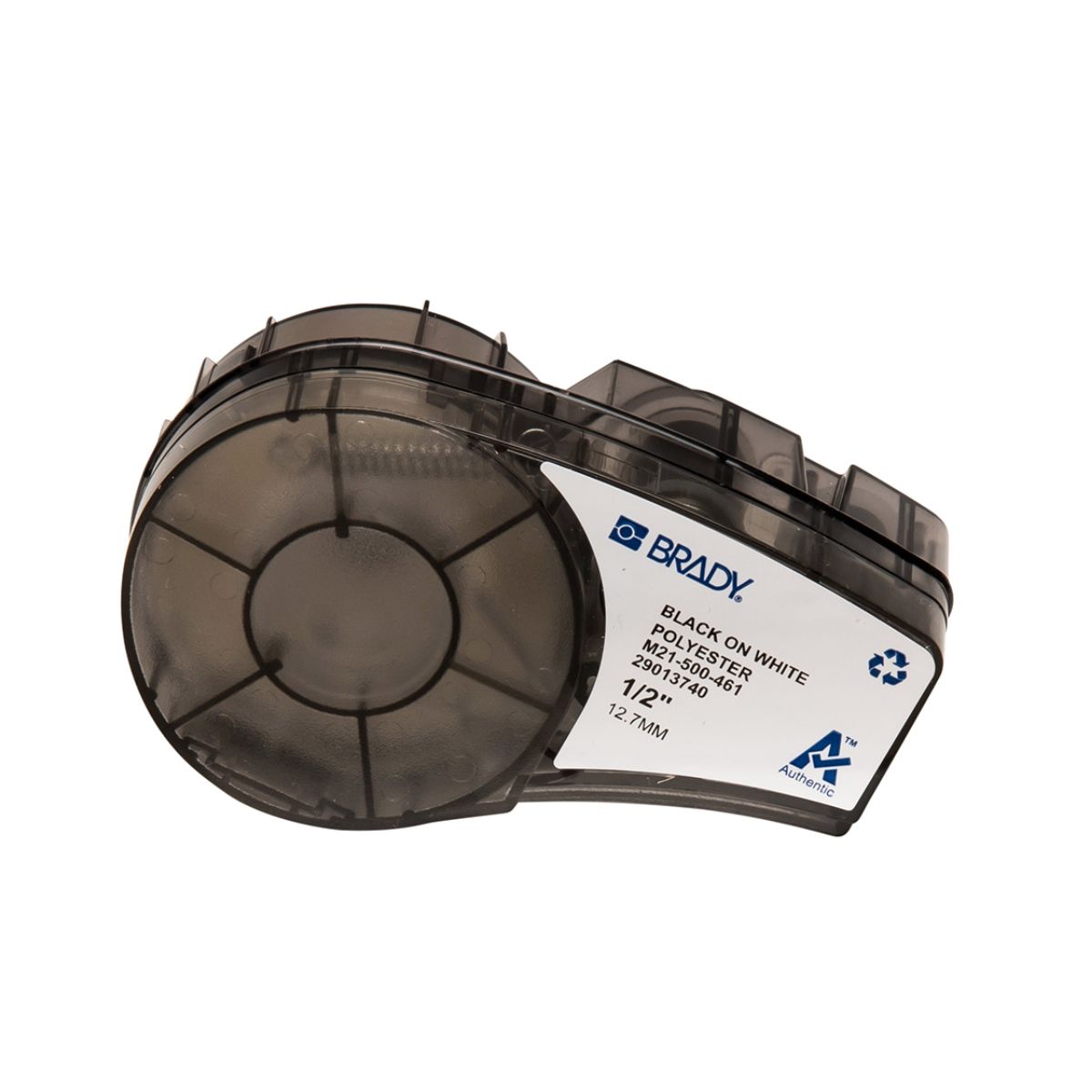 Etiqueta em poliéster autolaminado B461 da Brady, compatível com impressoras BMP21 Plus e BMP Lab. Na cor preto sobre branco, com largura de 0,500" (12,70 mm) e comprimento de 21' (6,4 m), proporciona identificação robusta e durável para cabos e fios médios, oferecendo proteção extra contra abrasão, produtos químicos e desgaste ambiental.