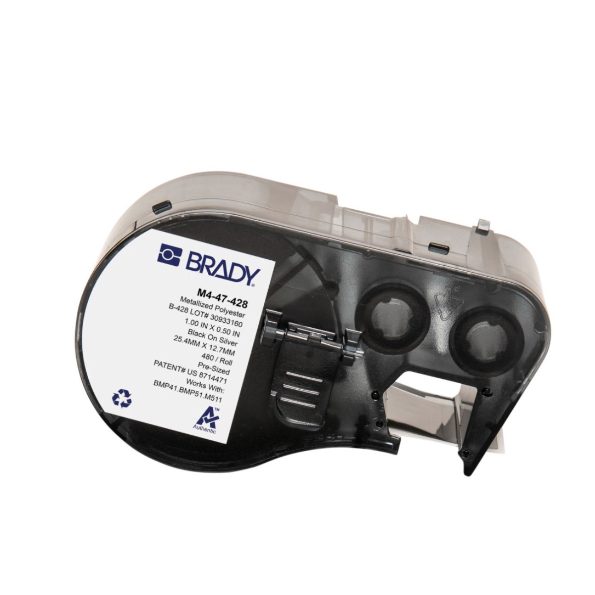 A Etiqueta Brady B428 M4-47-428 é fabricada em poliéster metalizado de alta qualidade, apresentando dimensões de 25,4 mm de largura por 12,7 mm de altura. Este material premium possui superfície metalizada cinza clara que oferece aparência profissional e sofisticada, com excelente contraste para impressões em preto. O poliéster metalizado proporciona durabilidade excepcional contra abrasão, produtos químicos, óleos, solventes e condições ambientais severas, sendo ideal para aplicações que exigem resistência superior e aspecto visual diferenciado.
