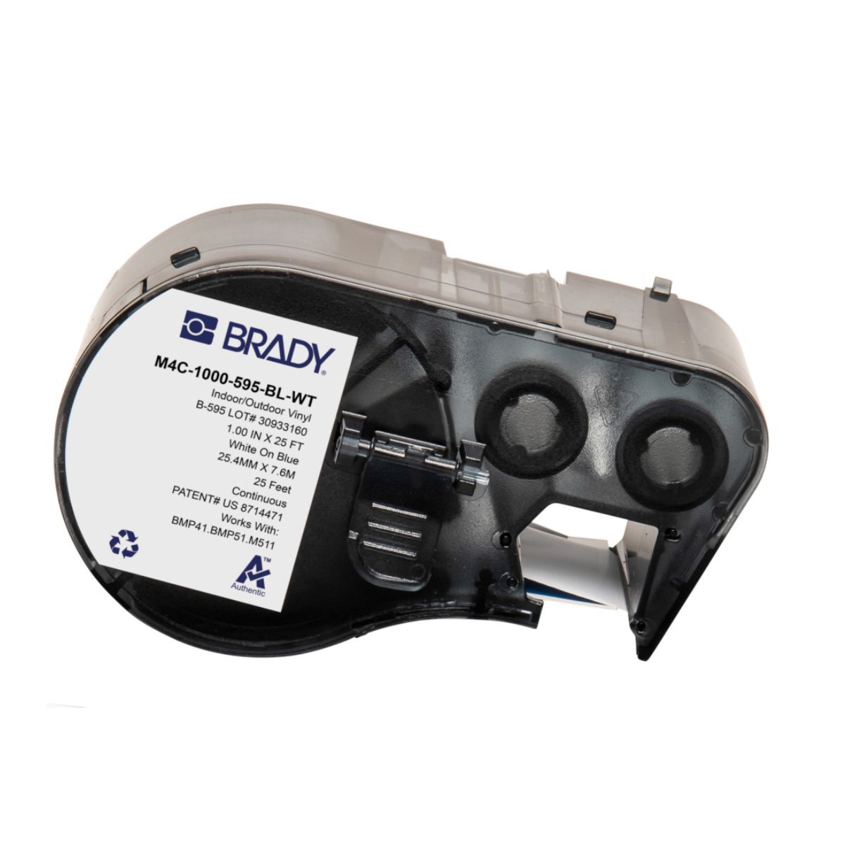 A Etiqueta Brady B595 M4C-1000-595-BL-WT é fabricada em vinil de alta qualidade, apresentando 25,4 mm de largura (1,000") e disponível em rolo de 25 pés (7,62 metros). Este material premium possui superfície azul com impressão em branco, oferecendo excelente contraste para boa legibilidade e identificação por cores. O vinil proporciona boa durabilidade contra abrasão, água, óleos e condições ambientais, sendo ideal para aplicações que exigem identificação permanente com codificação por cores para organização e classificação em grande escala.