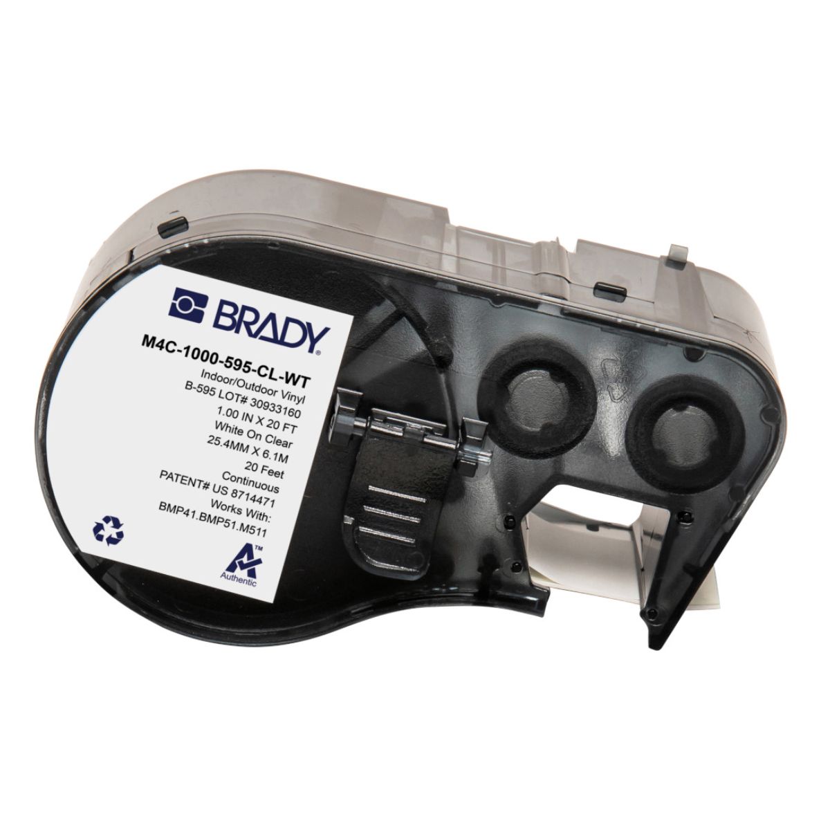A Etiqueta Brady B595 M4C-1000-595-CL-WT é fabricada em vinil transparente de alta qualidade, apresentando 25,4 mm de largura (1,000") e disponível em rolo de 25 pés (7,62 metros). Este material premium possui superfície transparente com impressão em branco, criando um efeito discreto e profissional que mantém a aparência original do equipamento. O vinil proporciona boa durabilidade contra abrasão, água, óleos e condições ambientais, sendo ideal para aplicações que exigem identificação permanente com discrição visual e amplo espaço para informações.