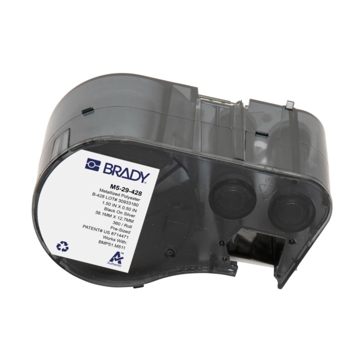 A Etiqueta Brady B428 M5-29-428 é fabricada em poliéster metalizado prateado de alta qualidade, apresentando formato retangular de 38,1 mm de largura por 12,7 mm de altura (1,50" x 0,50"). Este material premium possui superfície prateada metalizada que oferece aparência profissional e sofisticada, com excelente contraste para impressões em preto. O poliéster metalizado proporciona durabilidade excepcional contra abrasão, produtos químicos, óleos, solventes e condições ambientais severas, sendo ideal para aplicações que exigem resistência superior e aspecto visual diferenciado.