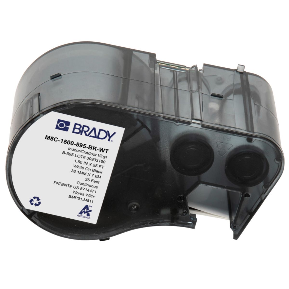 A Etiqueta Brady B595 M5C-1500-595-BK-WT é fabricada em vinil de alta qualidade, apresentando 38,1 mm de largura (1,50") e disponível em rolo de 25 pés (7,62 metros). Este material premium possui superfície preta com impressão em branco, oferecendo excelente contraste para máxima legibilidade. O vinil proporciona boa durabilidade contra abrasão, água, óleos e condições ambientais, sendo ideal para aplicações que exigem identificação permanente com alto contraste visual e amplo espaço para informações textuais extensas.